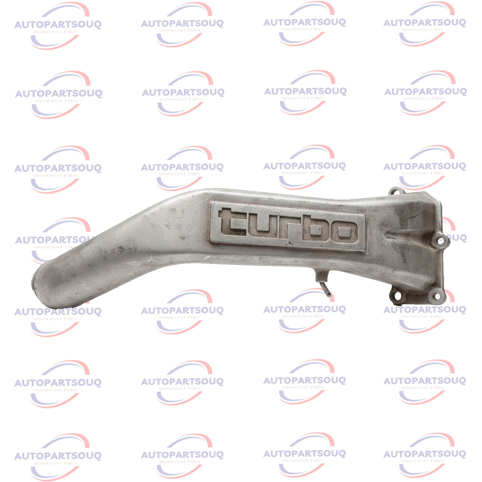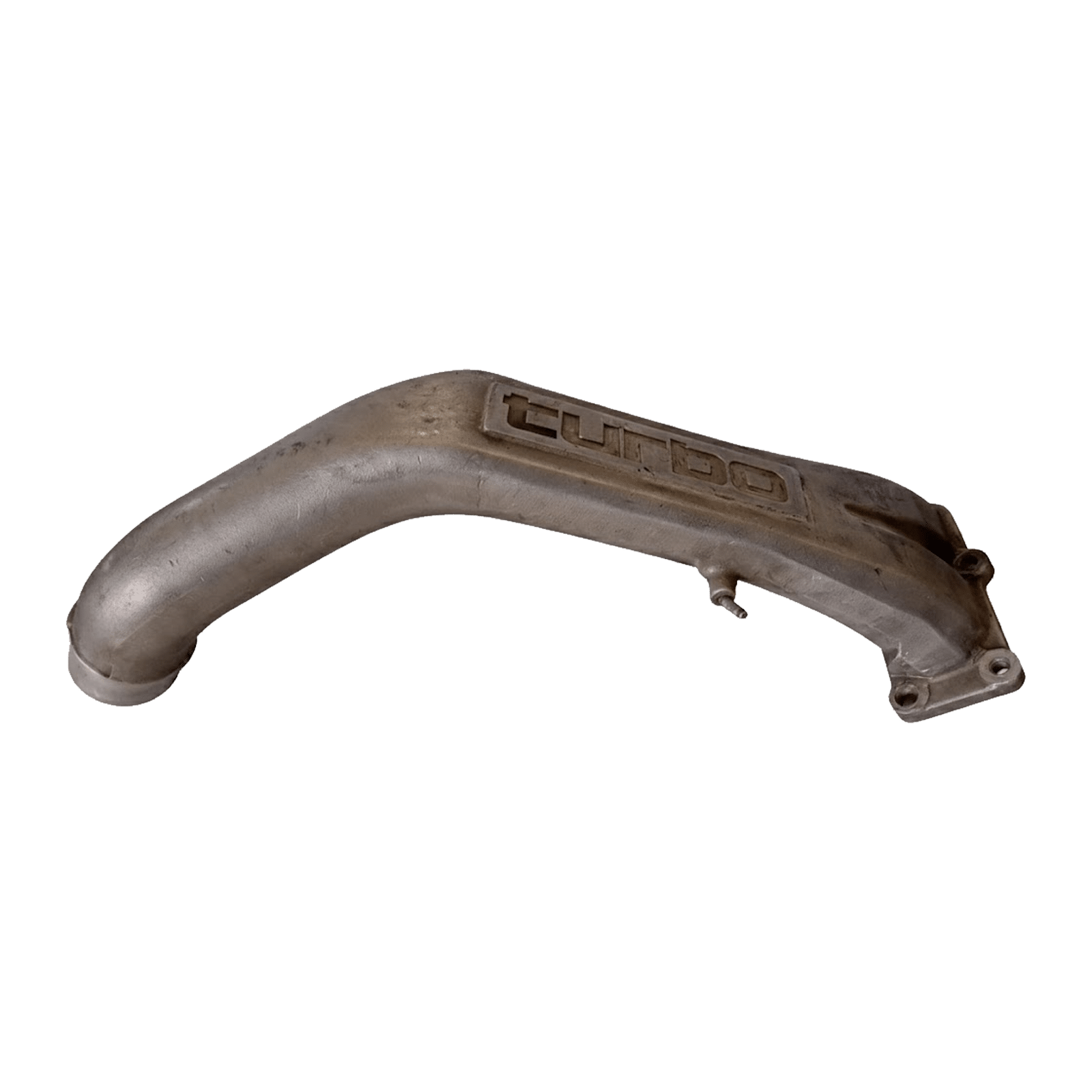 The pipe features the word “TURBO” cast in relief on its upper surface, a characteristic visual identifier for this specific OEM component. It is designed to route the pressurized air from the turbocharger to the intake manifold of the engine