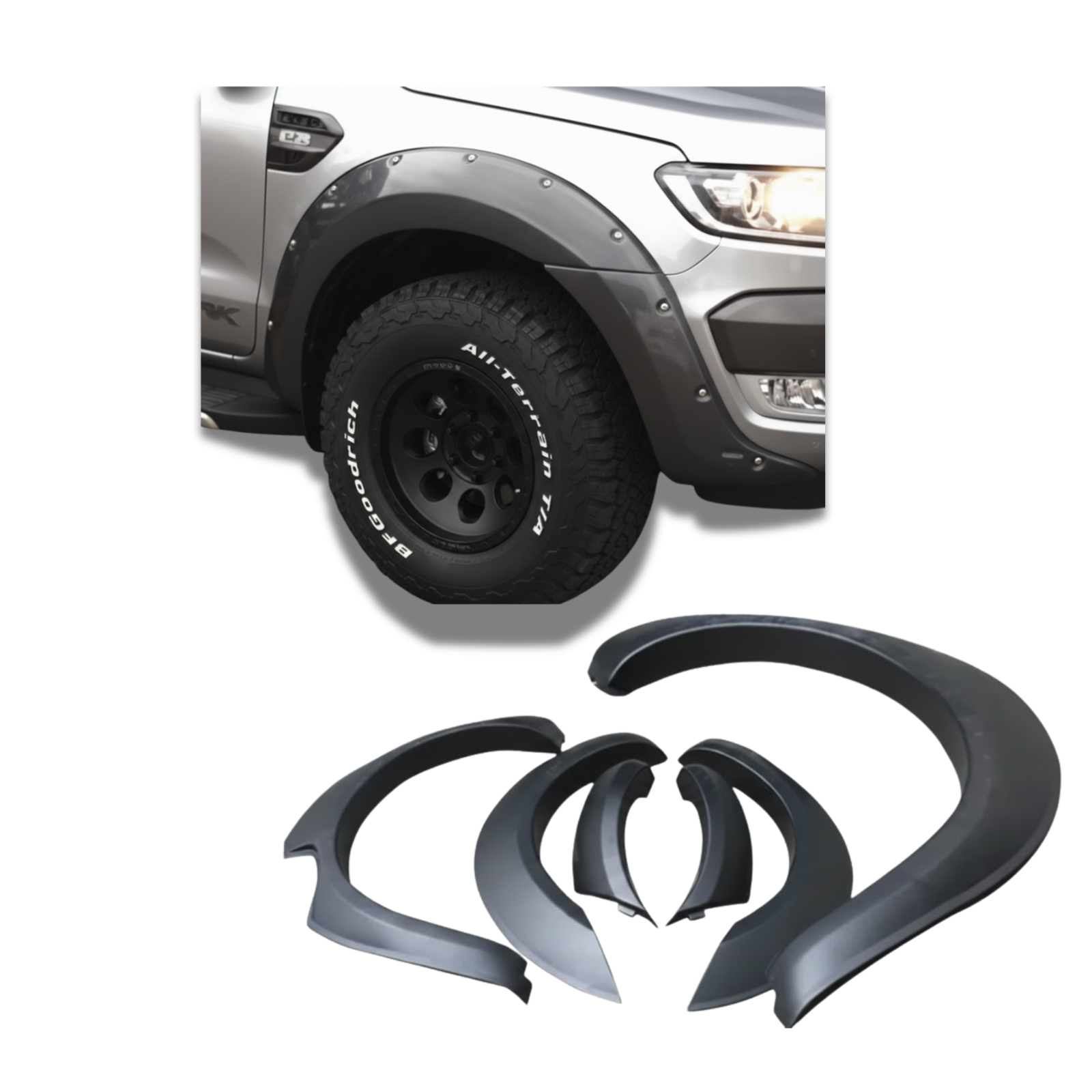 Description: Ford Ranger T7 pocket rivet style fender flare set, imported stock.
