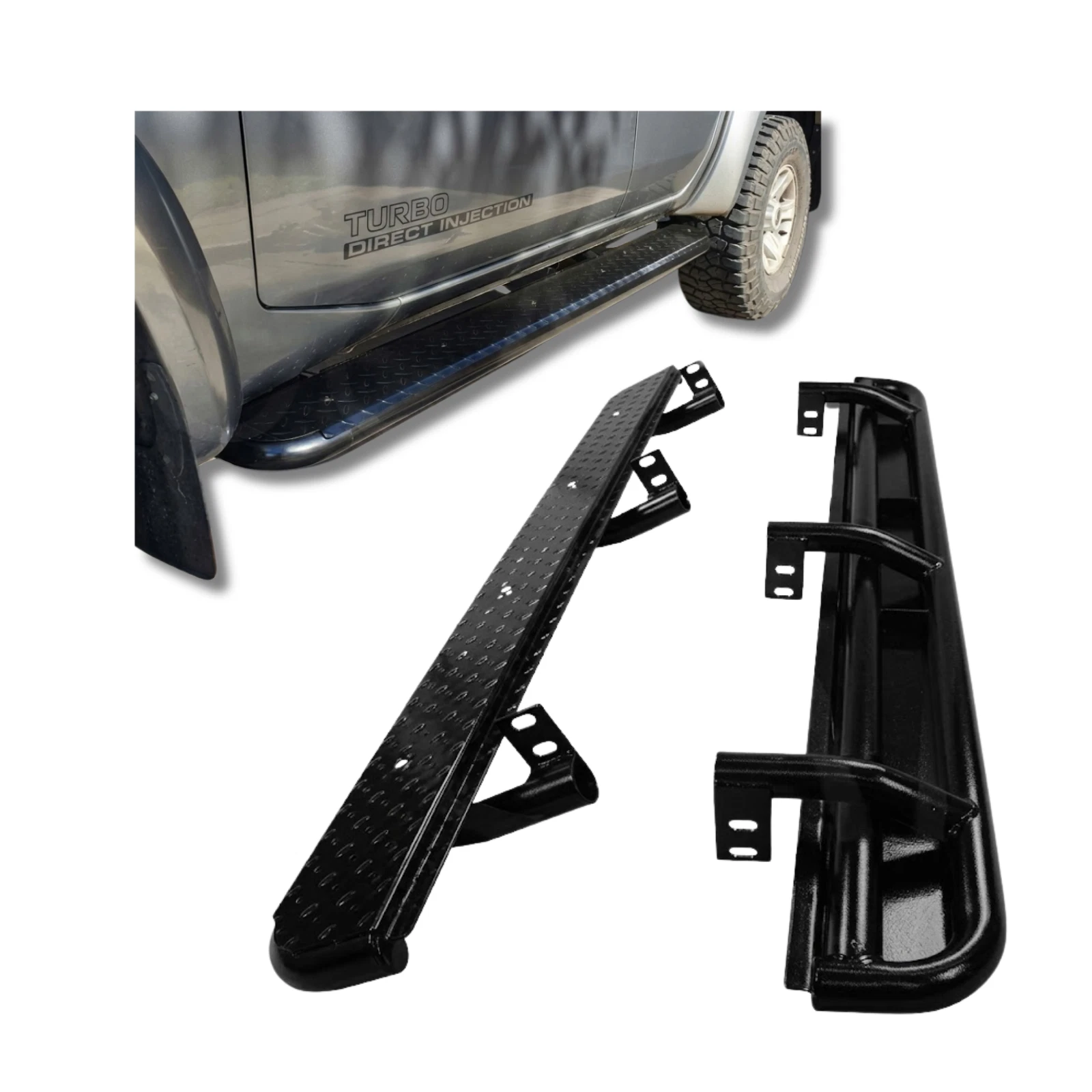 Description: Heavy-duty steel rock sliders side steps, imported stock.