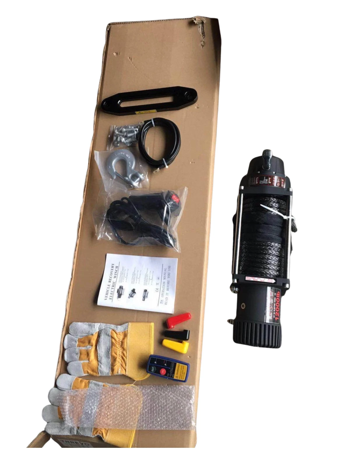 This high-performance 9500lb electric winch features a durable synthetic rope and dual wireless/wired control for reliable vehicle recovery. Designed for 12V and 24V off-road applications, it includes a complete kit with a fairlead, hook, and safety gloves.